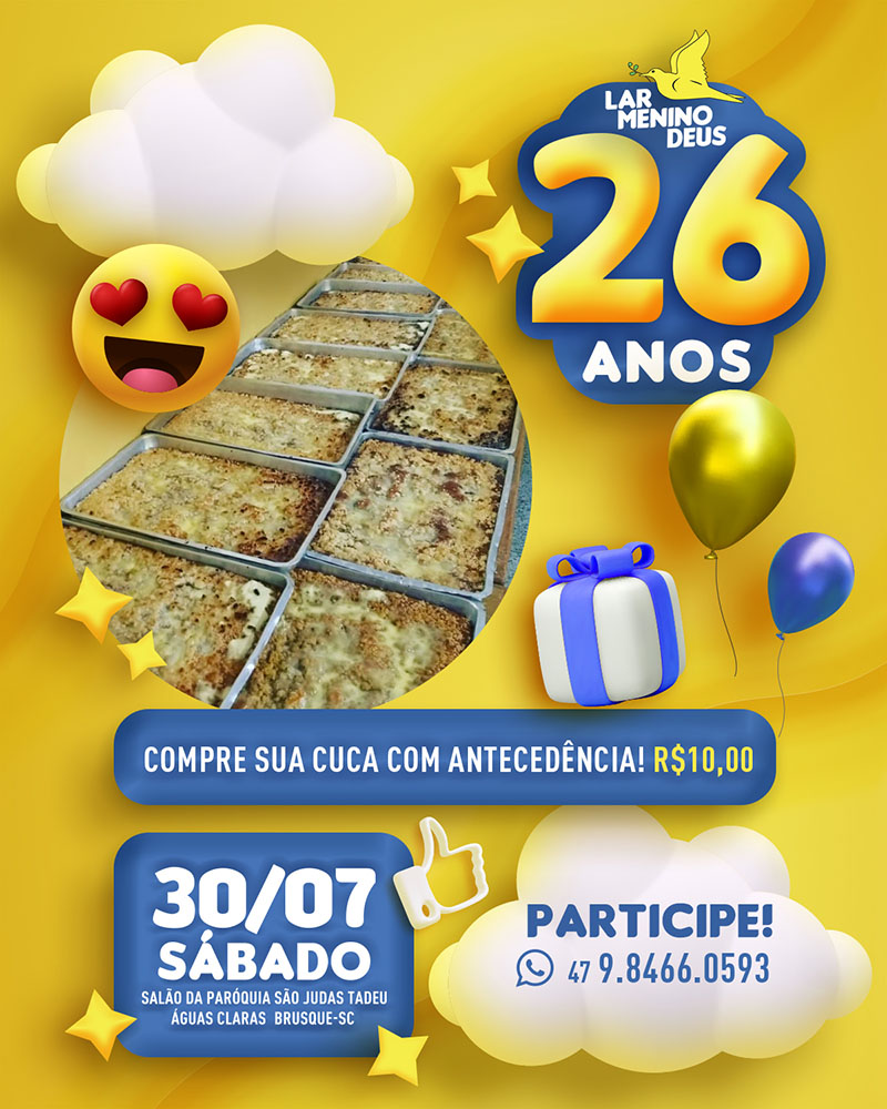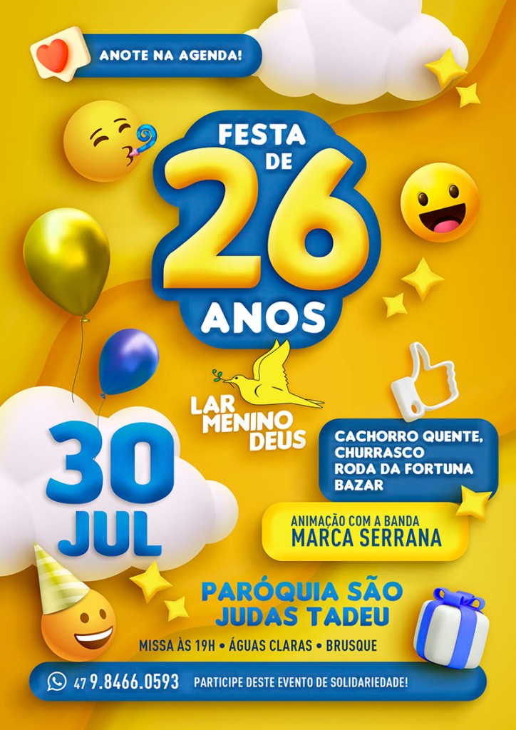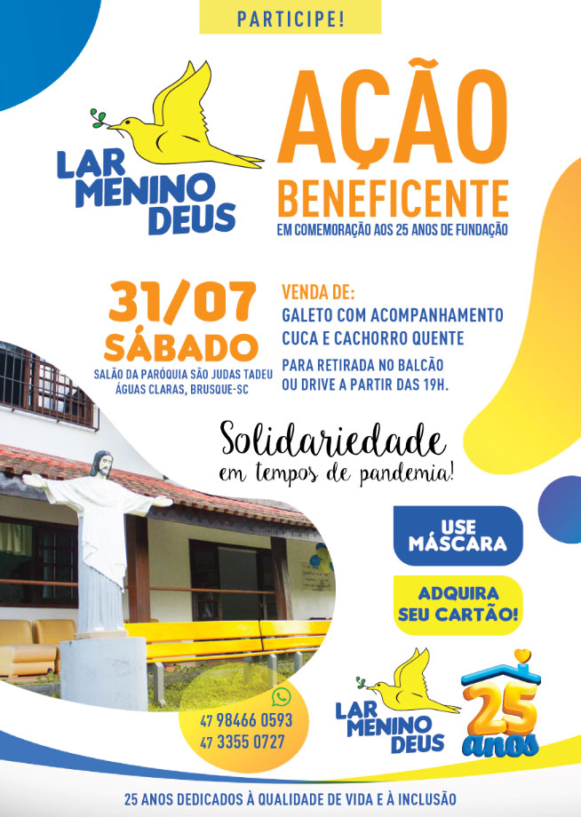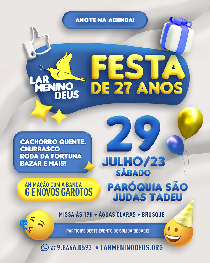 A tradicional festa de fundação do Lar Menino Deus acontece dia 30 (sábado) de julho de 2022, na Paróquia São Judas Tadeu, bairro Águas Claras, Brusque (SC).