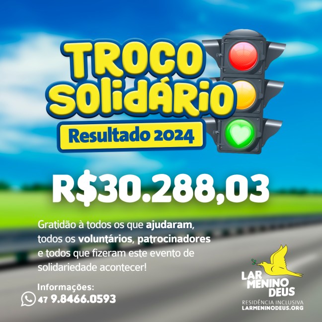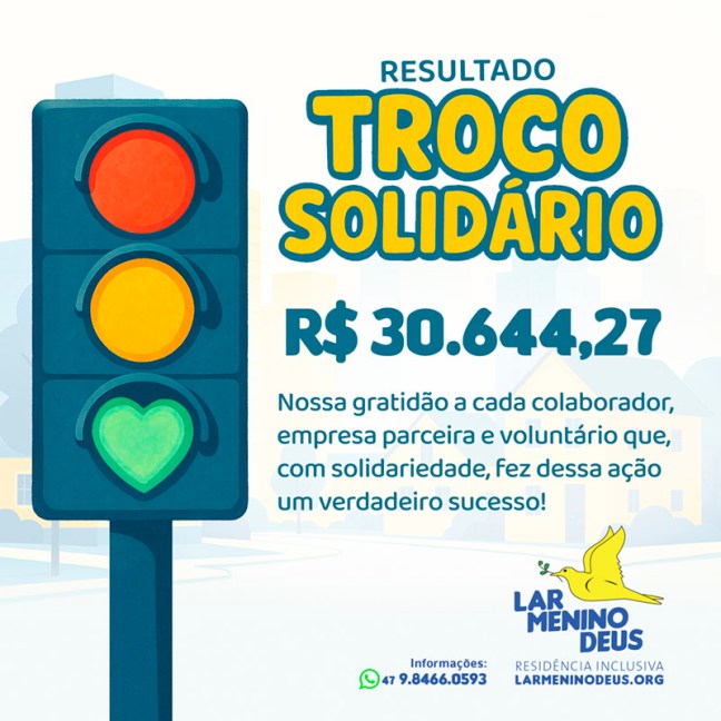 É com grande satisfação que divulgamos o resultado do Troco Solidário realizado no dia 10 de maio de 2025, foi arrecadado o valor de R$ 30.644,27 (trinta mil, seiscentos e quarenta e quatro reais e vinte e sete centavos).