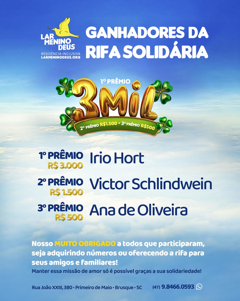 Parabéns aos sorteados da Rifa de Natal do Lar Menino Deus! 💛💙