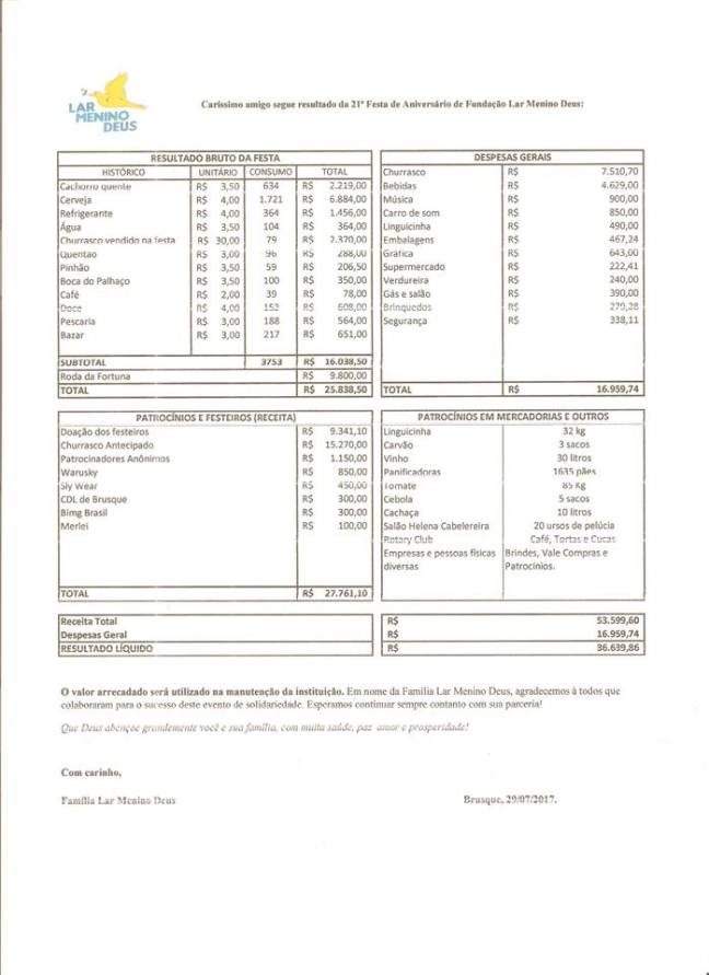 Arrecadando o valor líquido de R$58.000,00. Valor que será utilizado na manutenção da Instituição.