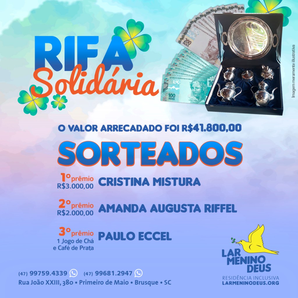 Muita gratidão a todos que contribuíram oferecendo e adquirindo os números, graças a solidariedade de vocês foi possível alcançar este sucesso em mais um evento do LAR MENINO DEUS!